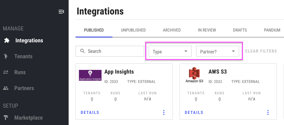 When viewing your list of integrations, you can filter out your integrations by type (External vs Internal) and also if the integration was developed by a Partner.