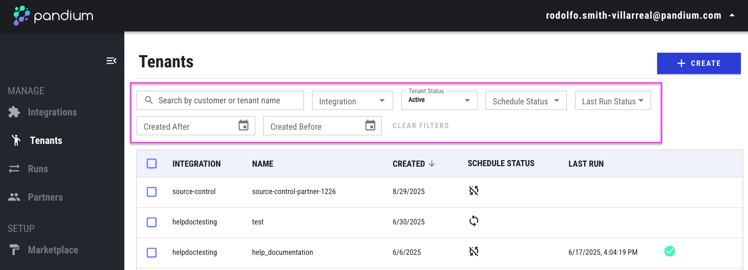 As a Pandium user, there may be instances where you need to quickly parse out specific integration-related details without having to manually sift page by page. You may be managing a large number of tenant runs and need to find ones with a specific status, or maybe you're looking for tenants that use a particular release version to troubleshoot an issue. This could be because you're onboarding a new team member who needs to understand your current setup, or maybe you're auditing, or simply performing integrations maintenance.