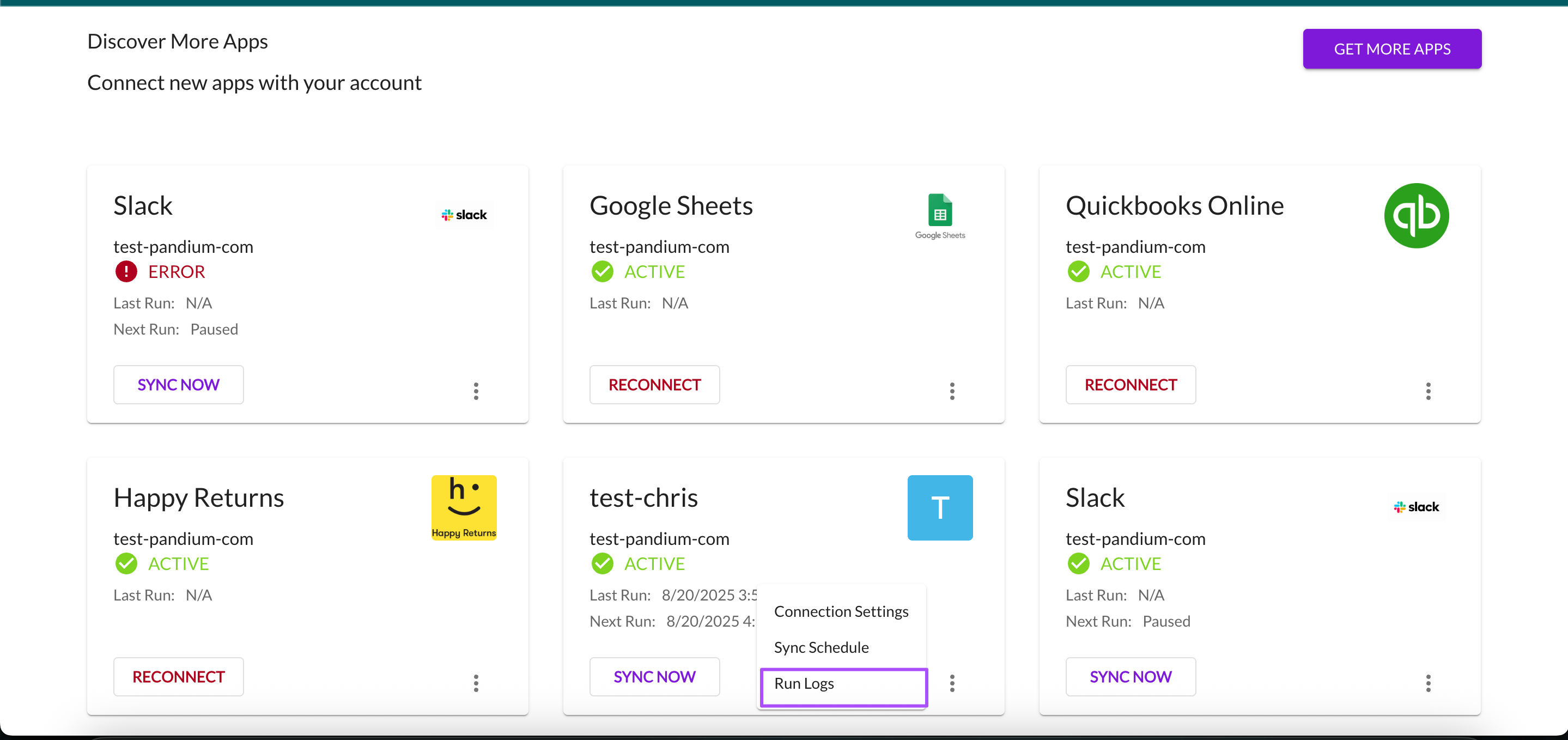 Runs - This will display a list of all runs associated with integration-specific tenants.