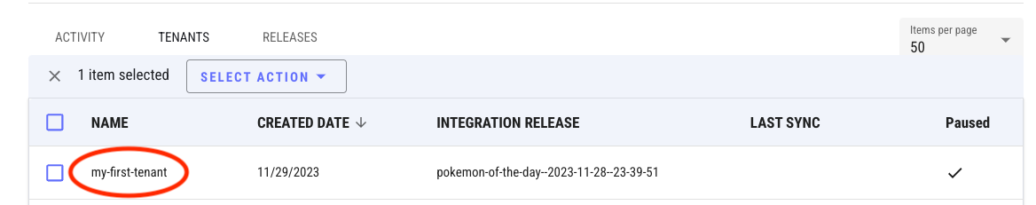 7. Click the **Tenants** tab.  This will display a list of your integration's tenants.  Right now there should be one.