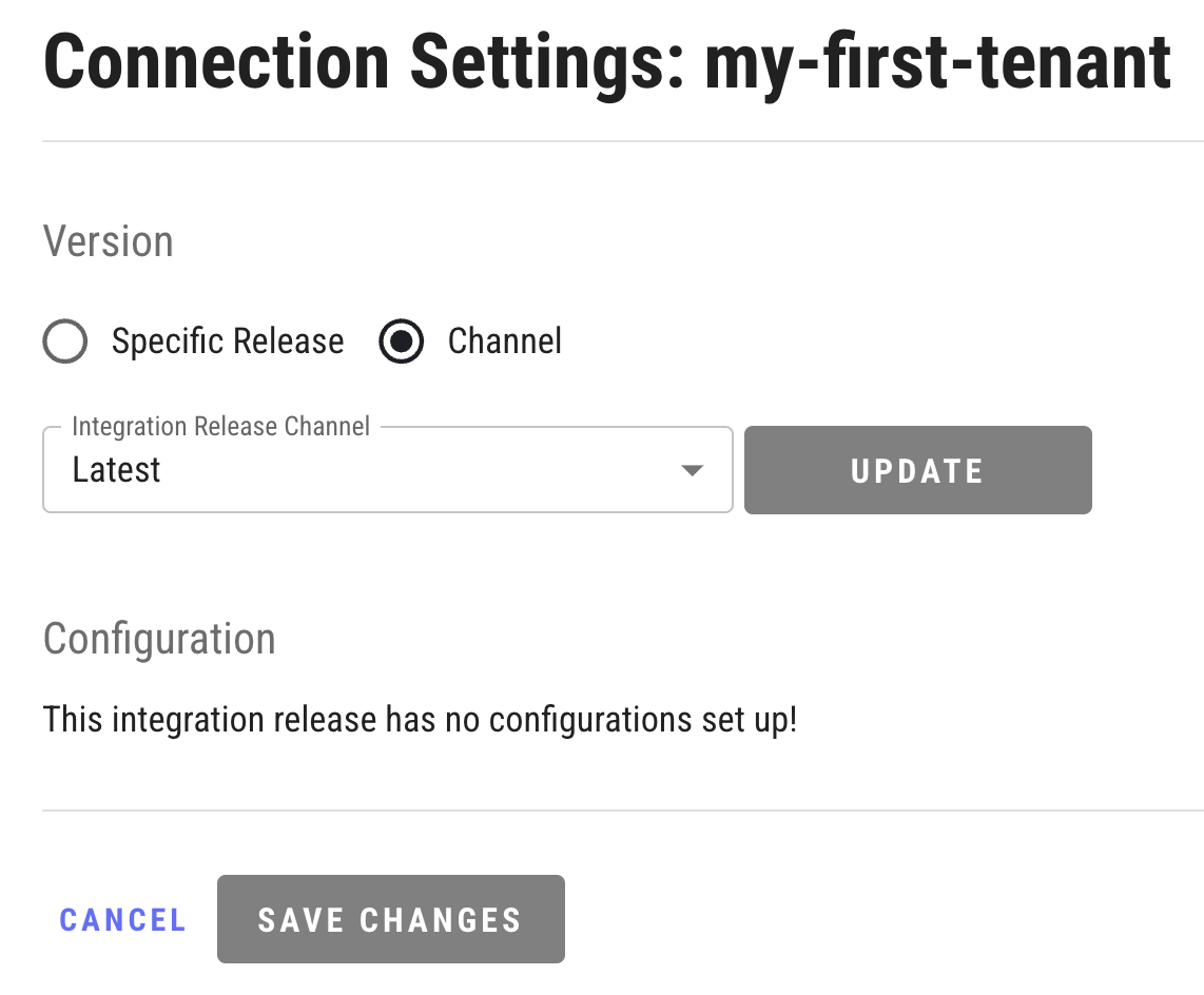 9. Click **Settings**.  This will display the *Connection Settings* page.  Since your release channel is *Latest* the tenant has been automatically updated to the new release you just made.