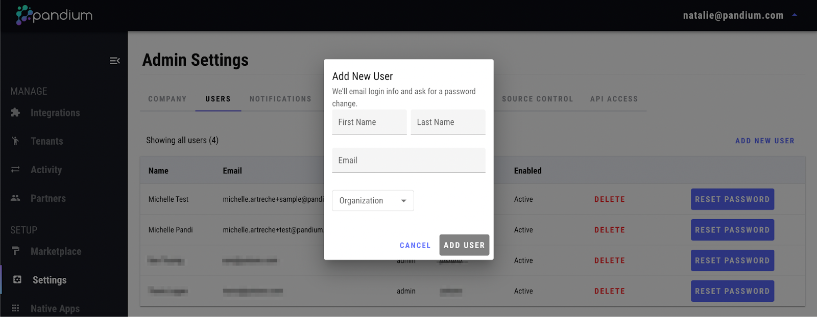To add a new user to Pandium, navigate to “Settings” in the navigation sidebar, then “Users” in the top bar within the Settings resource.