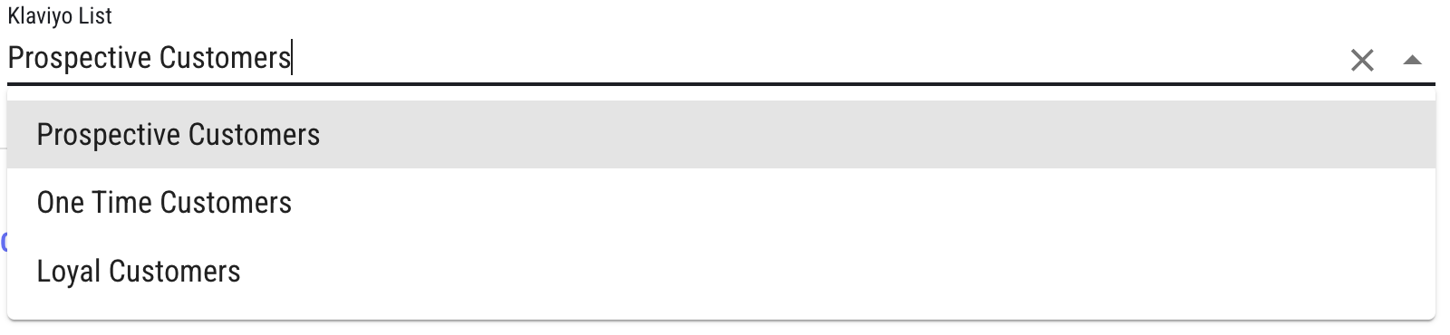 <figure><img src="https://4017407078-files.gitbook.io/~/files/v0/b/gitbook-x-prod.appspot.com/o/spaces%2F-MfJn-9R_dn6dvcGNcdk%2Fuploads%2F81pjLAZacCkIdQx7UCBw%2Fz3wg-ikukCtZCPgmTLeWDazyiuGluniZAwQjWouOD52CvnHemLgBs83aIWQeZcQM29O-o1YnQNrFxorAxVuykjMXbU1d1AqMEE8e8k9Lte9eQEeRqHJBqI-gJBAV.png?alt=media&#x26;token=9b37ec37-dbbe-41d3-8f1b-f90d18b549a8" alt=""><figcaption><p>Klaviyo List selector with dynamic options after the init sync</p></figcaption></figure>
