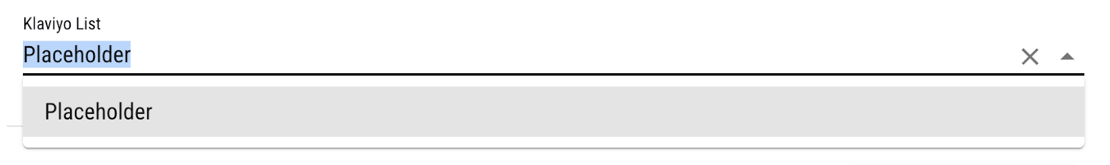 <figure><img src="https://4017407078-files.gitbook.io/~/files/v0/b/gitbook-x-prod.appspot.com/o/spaces%2F-MfJn-9R_dn6dvcGNcdk%2Fuploads%2FtycUgokELFX7sSk2qtlA%2FbGrSR4dBzKcUrGkn-Om_08eXTD3ypS6SXQb9Mvo49EpoT9NYu5ZiaO6iZAGiz8g795kUtUNVDOmtc9k1jifrpaybo62mn0PB0TuEAd1epbDkwvth0In0bO29PBBk.png?alt=media&#x26;token=098bc9d6-8306-44aa-97c4-b1ec5d5d6d7a" alt=""><figcaption><p>Klaviyo List selector with a placeholder before init sync is run</p></figcaption></figure>
